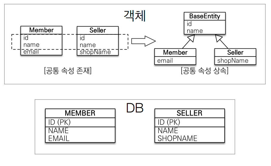 - 참고 : @Entity 클래스는 엔티티거나 @MappedSuperclass로 지정한 클래스만 상속 가능하다.