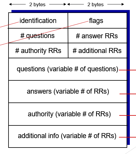 DNS 분산 데이터베이스를 구현한 DNS 서버들은 호스트 네임을 IP 주소로 매핑하기 위한 자원 레코드 (resource record, RR)를 저장한다. 각 DNS는 하나 이상의 자원 레코드를 가진 메시지로 응답한다.