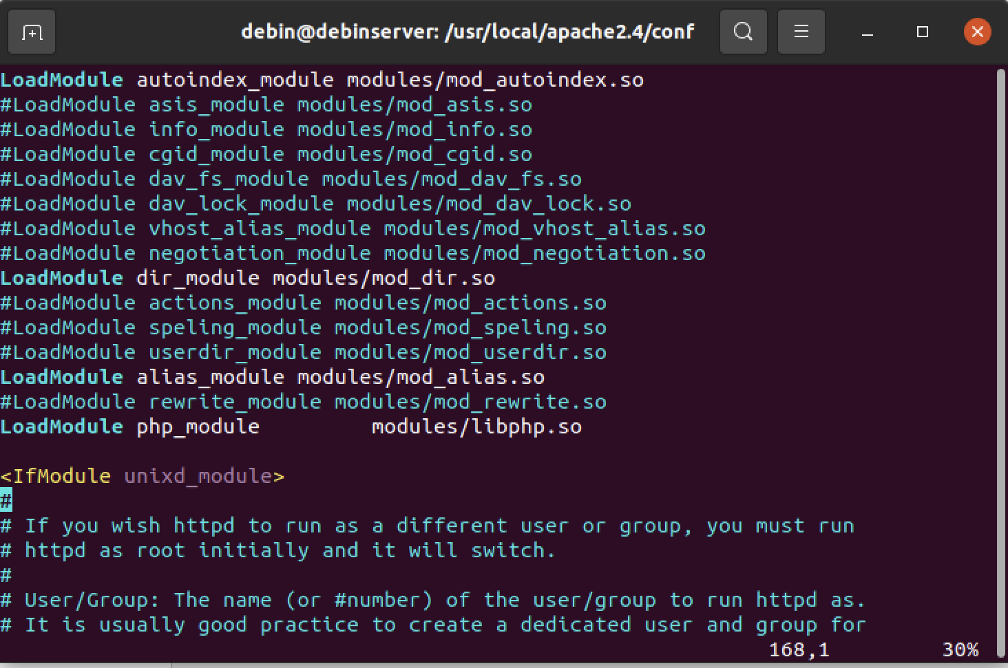 먼저 모듈 설치를 확인해보자. httpd.conf 파일을 열어 PHP 모듈이 설치됐는지 확인하자.