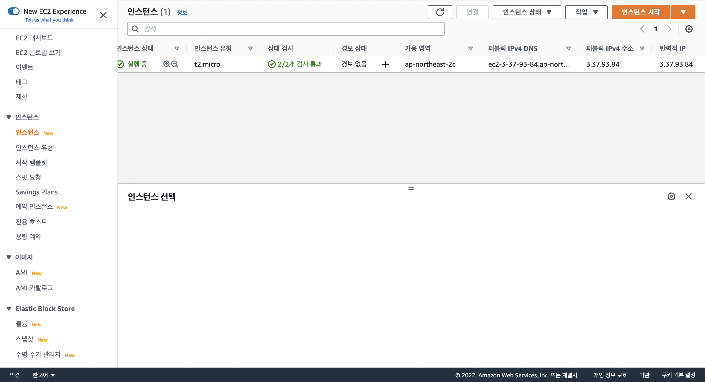 이제 우리는 탄력적 IP를 할당 받아 우리 인스턴스에 적용해 줄 것이다. 그냥 디폴트 값으로 생성하고 인스턴스와 IP를 연결하면 인스턴스 탄련적 IP 칸에 할당받은 탄력적 IP를 확인할 수 있다.