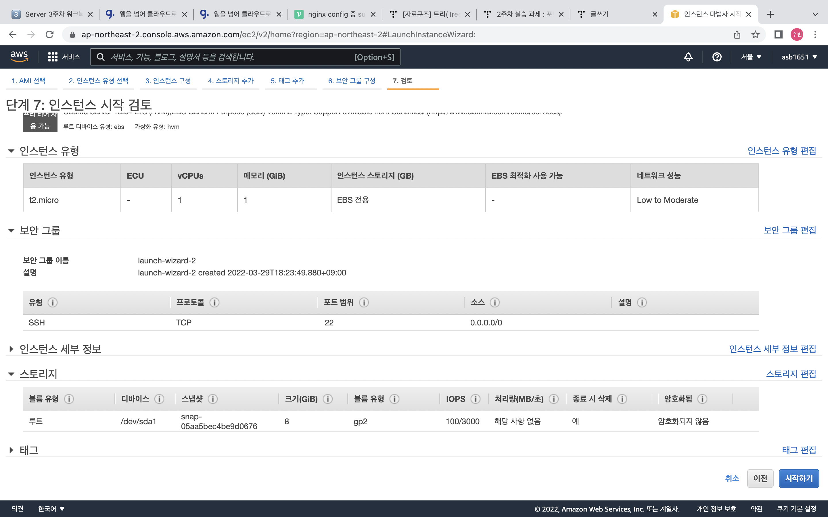 AWS EC2 인스턴스 생성 과정에 대해서도 짧게 정리를 해보겠다. 뒷 부분 캡쳐를 안해서 저번 시간보다는 부질하겠지만...