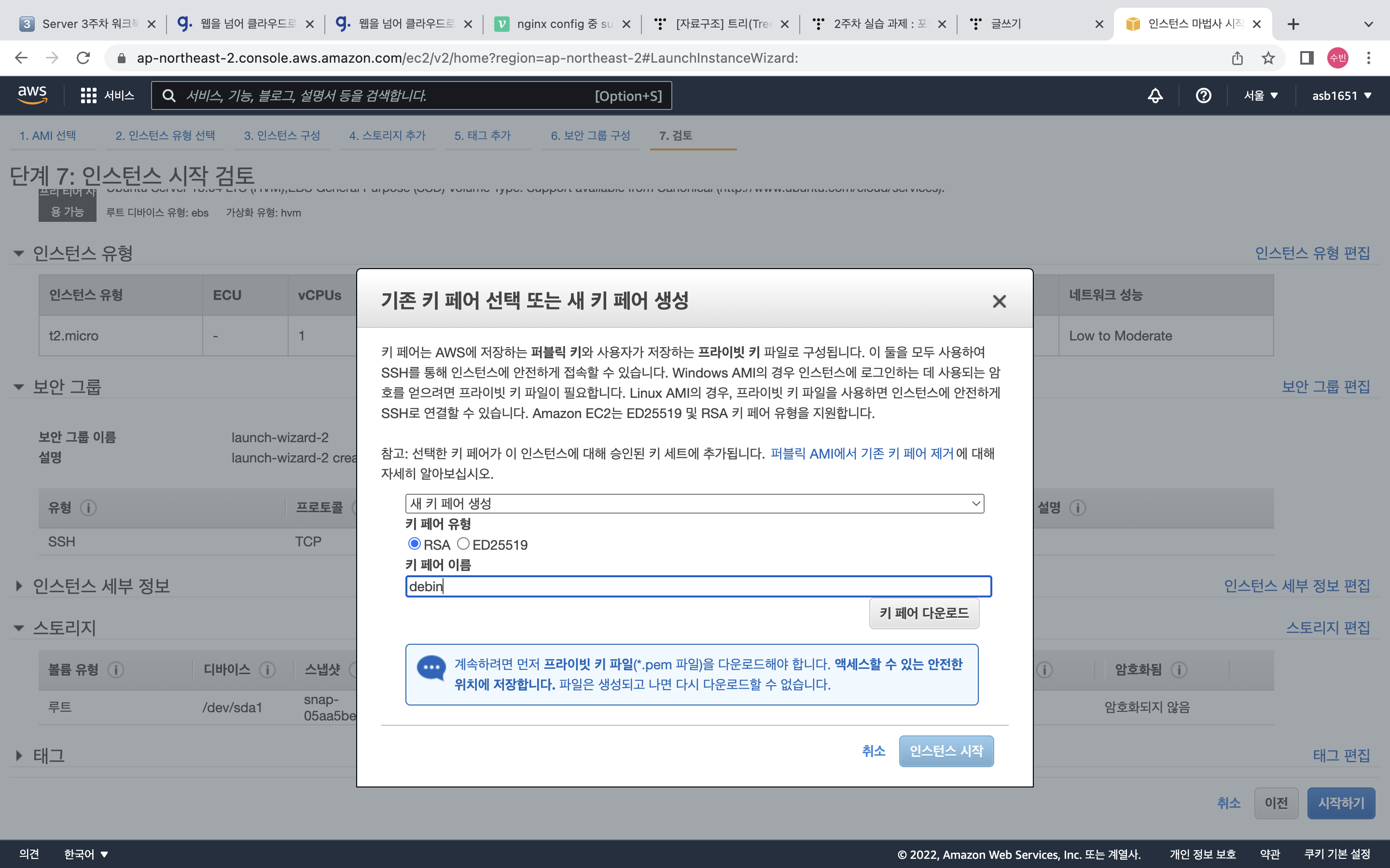 아래와 같이 작성하고 키 페어 다운로드를 누르면 debin.pem이라는 파일이 다운로드 된다.