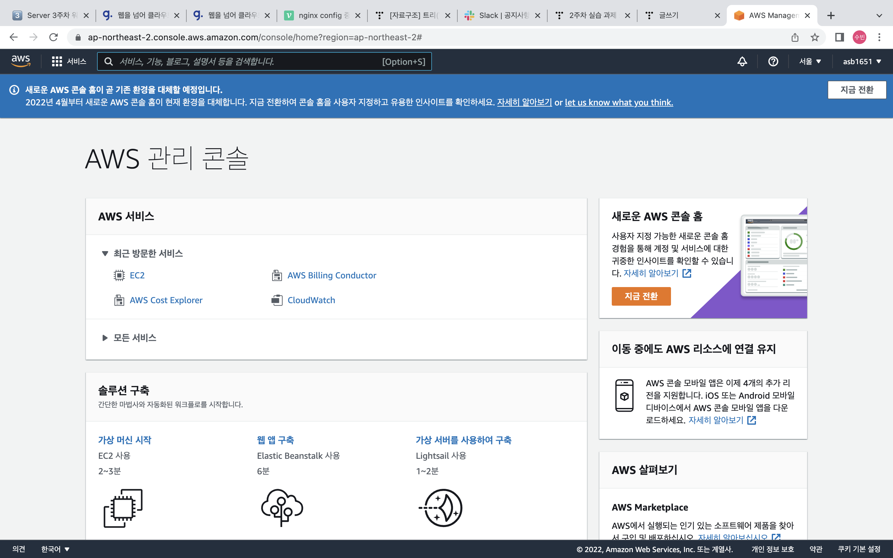 계정을 만들고 AWS 관리 콘솔에 들어가서 우측 상단 지역을 서울로 바꾸고 EC2 를 인스턴스를 만들러 EC2 서비스를 찾아서 클릭하자.