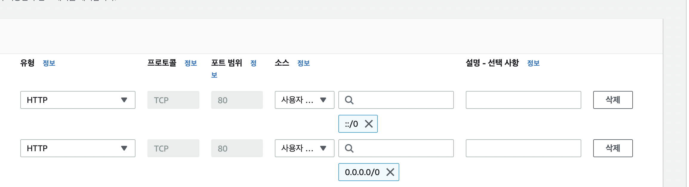 - 보안 그룹에 들어가서 소스를 내 IP로 지정한다. 차후에 더 수정할 것이다