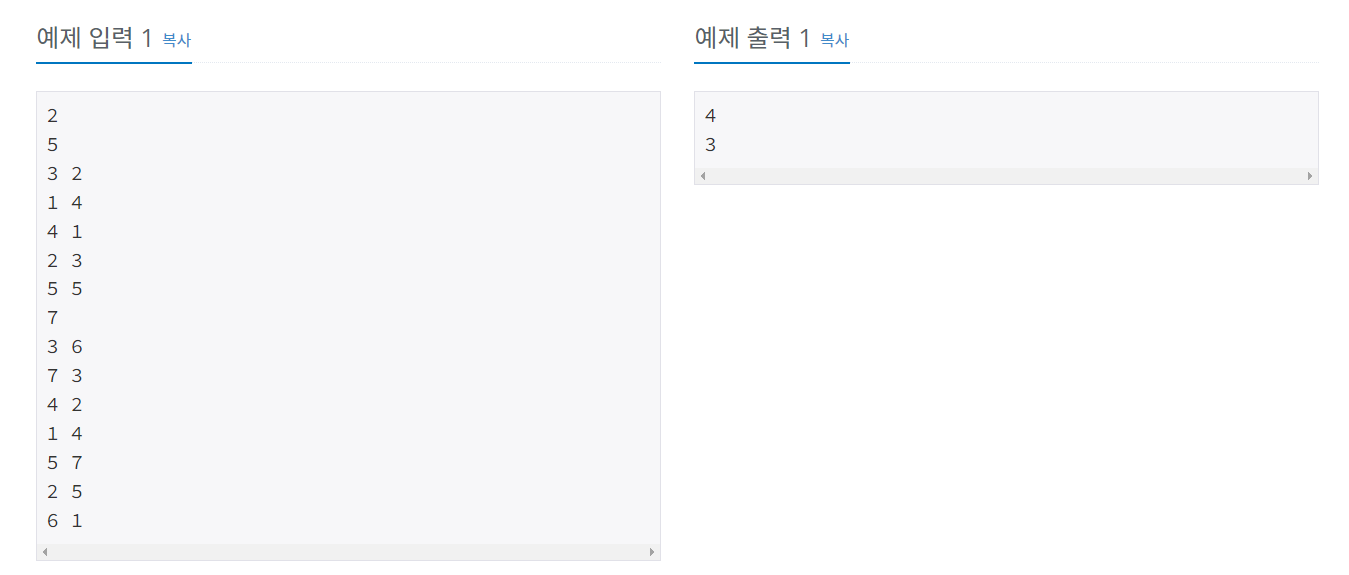 첫째 줄에는 테스트 케이스의 개수 T(1 ≤ T ≤ 20)가 주어진다. 각 테스트 케이스의 첫째 줄에 지원자의 숫자 N(1 ≤ N ≤ 100,000)이 주어진다. 둘째 줄부터 N개 줄에는 각각의 지원자의 서류심사 성