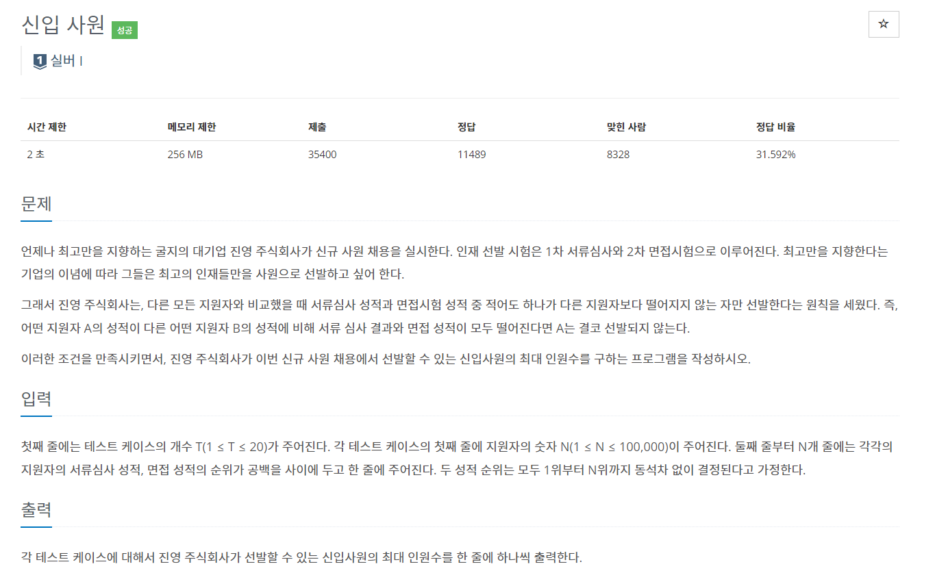 이 standard 변수를 가지고 비교해나가면서 count를 올리고, 합격자가 발생하면 standard 변수에 그들의 면접 등수를 넣어주면 된다. 이런 논리로 문제를 해결할 수 있다.