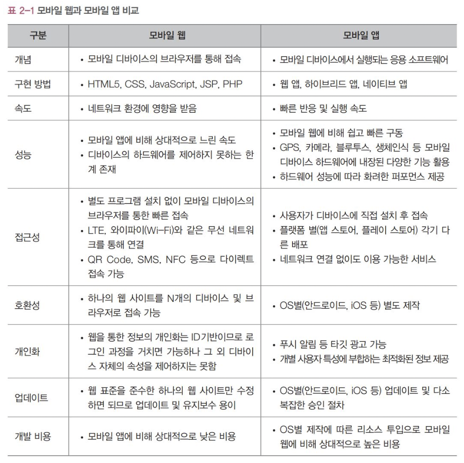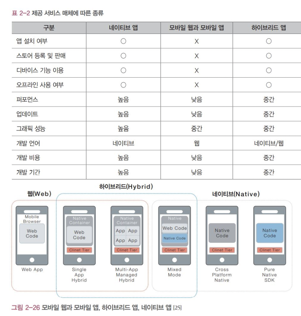- 제공되는 방식에 따라 모바일 웹과 모바일 앱, 하이브리드 앱, 네이티브 앱등으로 구분한다.