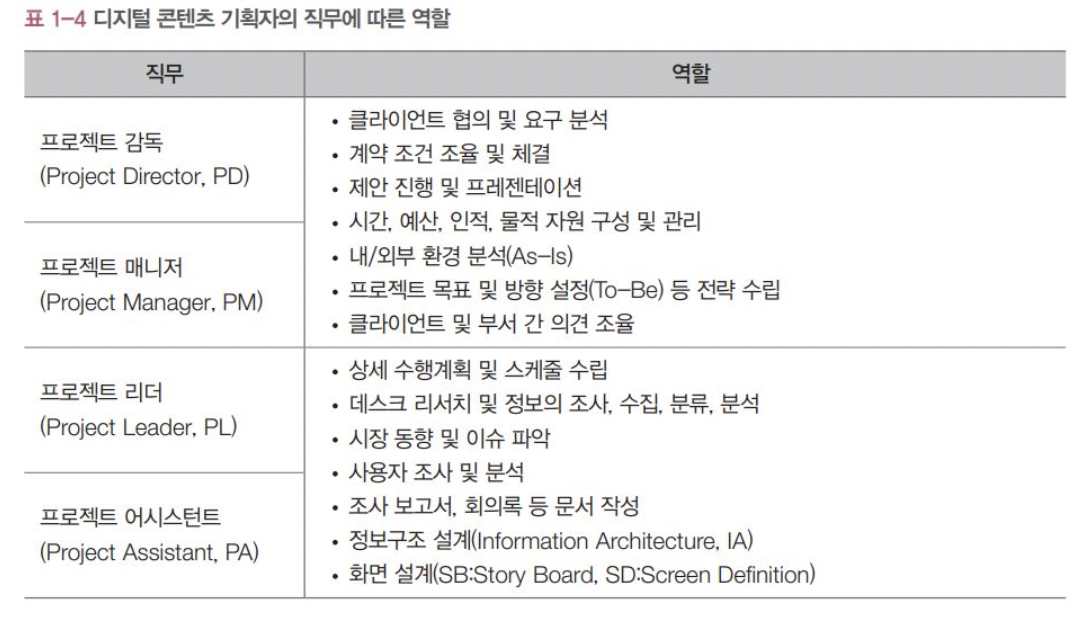 - 디지털 콘텐츠 기획자의 직무에 따른 역활은 아래 이미지와 같다.