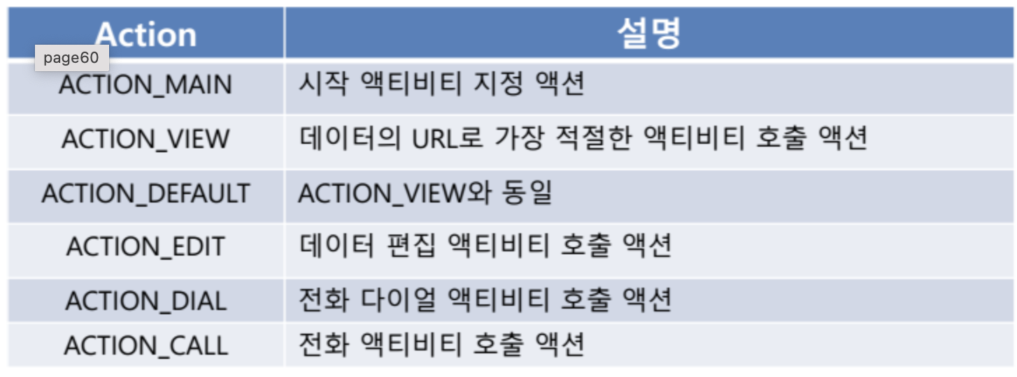 - 암시적 인텐트는 약속된 액션(Action)을 지정하여 안드로이드에서 제공하는 기존 응용 프로그램을 실행한다.