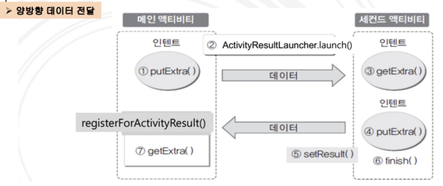 이전 시간 실습에서는 startActivity() 메소드는 단방향이다. 즉 데이터를 주고 받을 수 없다. 아래 링크에서 확인할 수 있다.