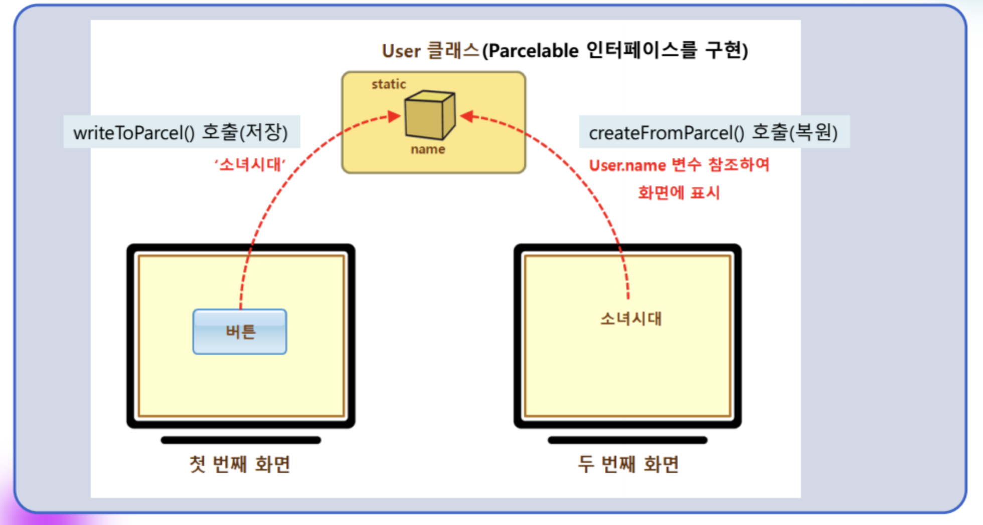 - 따라서 객체를 다른 액티비티에 전달하려면 Parcelable 인터페이스를 구현해야 함