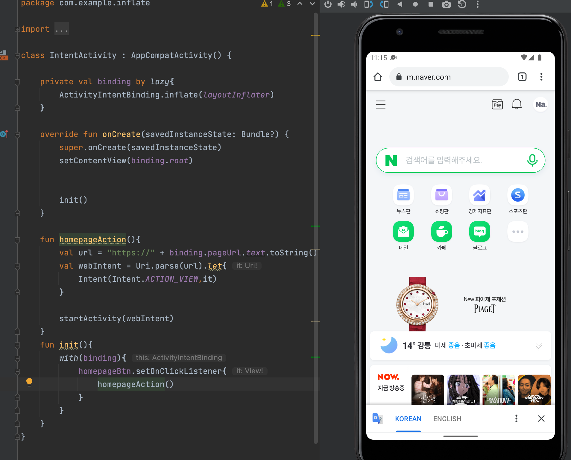 다음은 IntentActivity.kt 코드다.