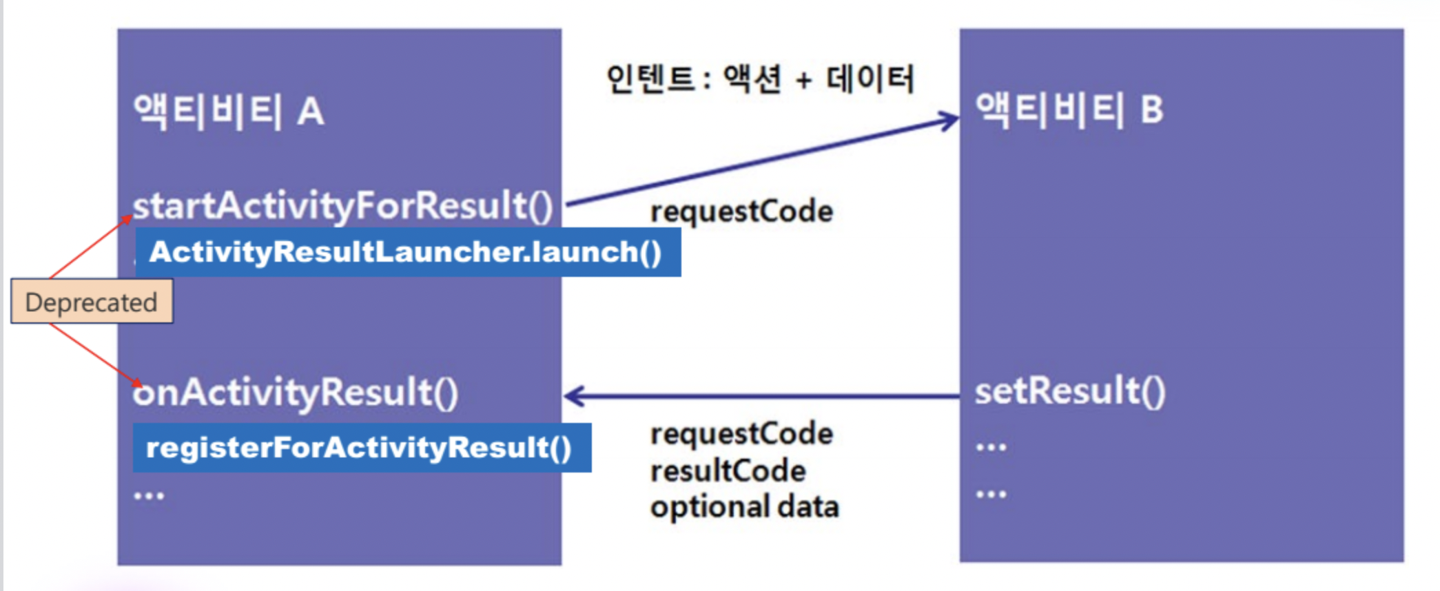 but 여기서 startActivityForResult와 onActivityResult는 Deprecated 되었다. 즉 더 이상 사용하지 않는다.