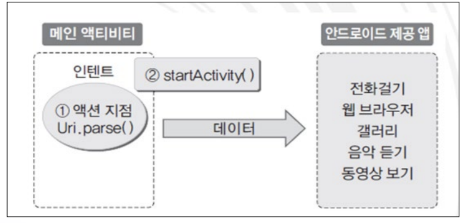 - 인텐트 안에 http:// 또는 "tel:"로 시작하는 MIME 타입의 정보를 넣어 시스템에 보내면 시스템이 이 정보를 해석하여 거기에 맞는 화면을 띄워준다.