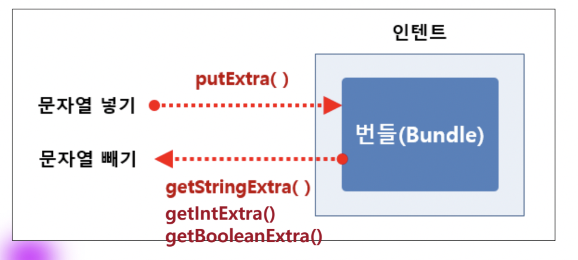 데이터를 담을 때는 putExtra() 메서드를 사용하고, 꺼낼때는 타입에 맞게 꺼내야하므로 getStringExtra(), getIntExtra(), getBooleanExtra() 등 다양한 메소드가 있다.