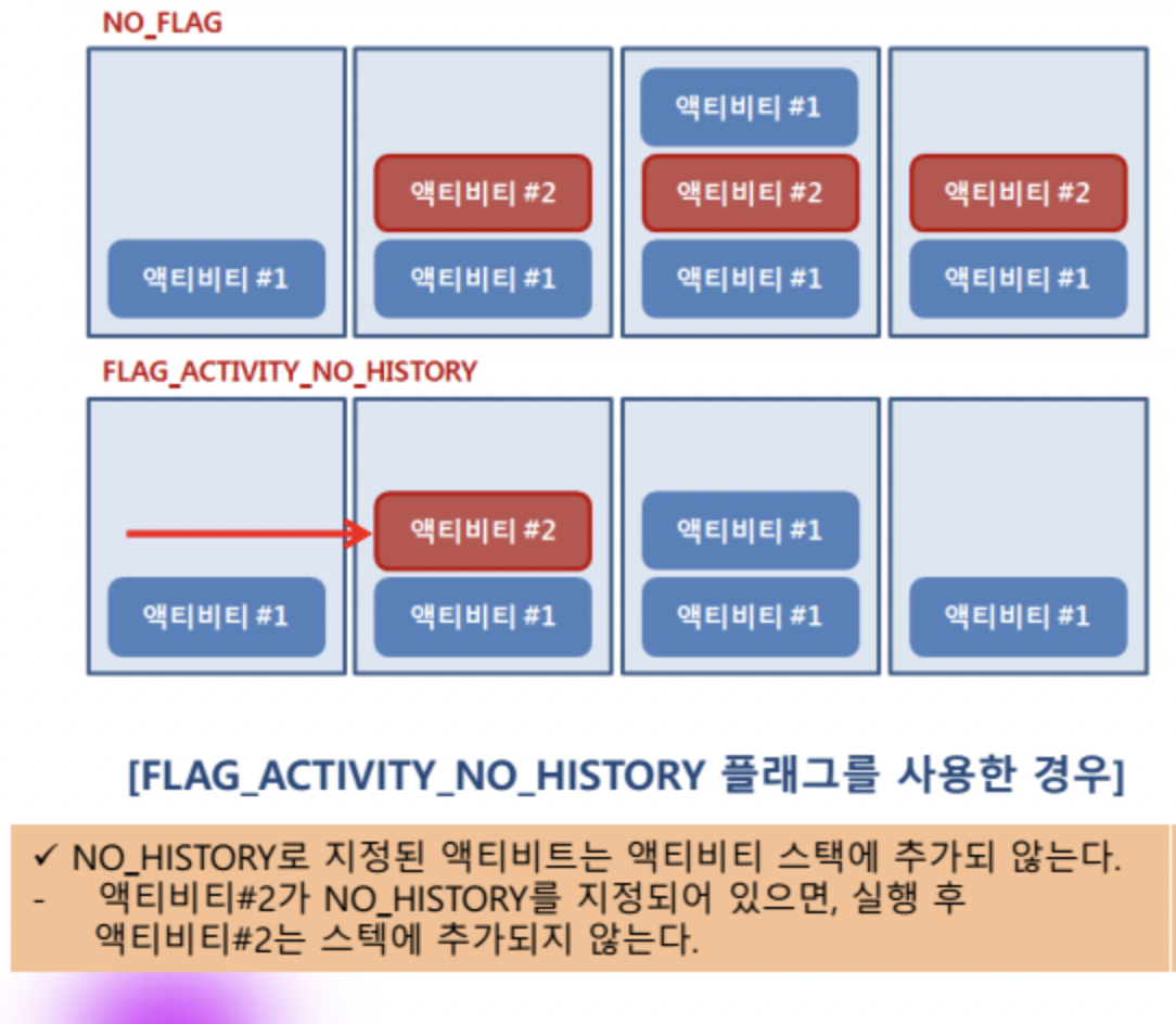- 새로운 액티비티를 실행할 때마다 메모리에 새로운 객체를 만들고 이전 화면 위에 쌓는 방식은 비효율적이다. 이를 해결하기 위해 플래그를 사용한다.