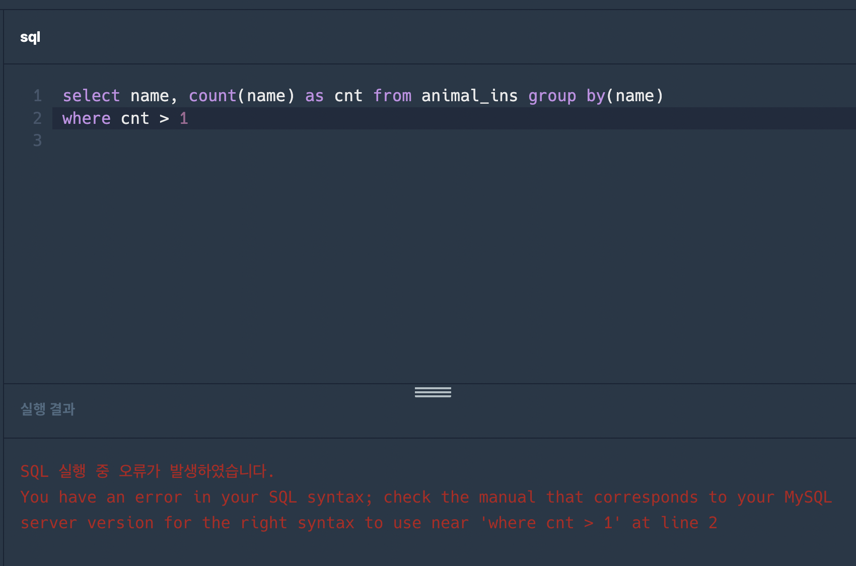 오류가 발생한 것을 확인할 수 있다. count(name) 은 cnt인데 집계함수를 where 절에서 사용할 수 없으므로 오류가 발새했다.