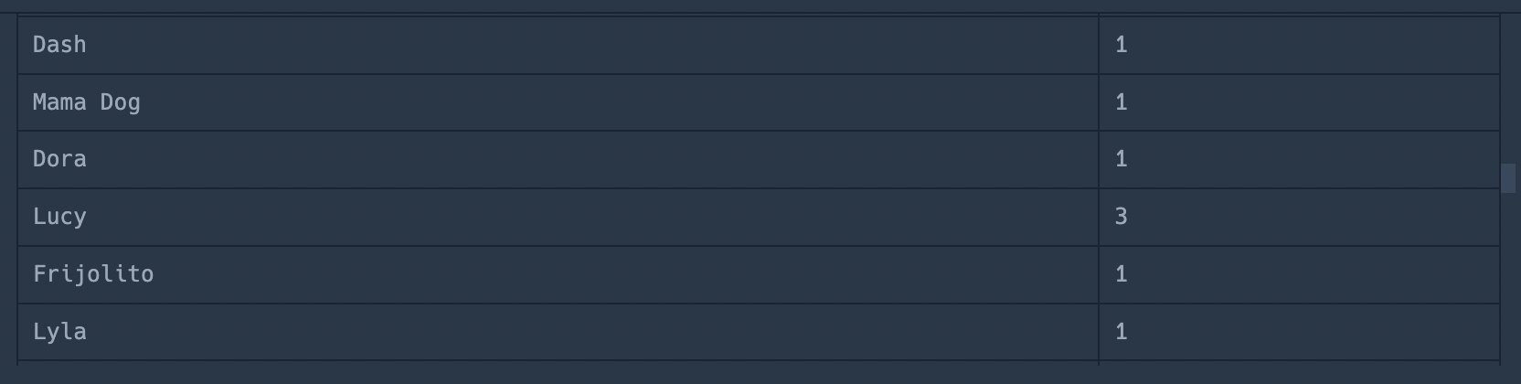 Lucy 같은 경우에는 cnt가 3인데, 이것은 Lucy라는 이름을 가진 동물이 3마리 있단 것이다.