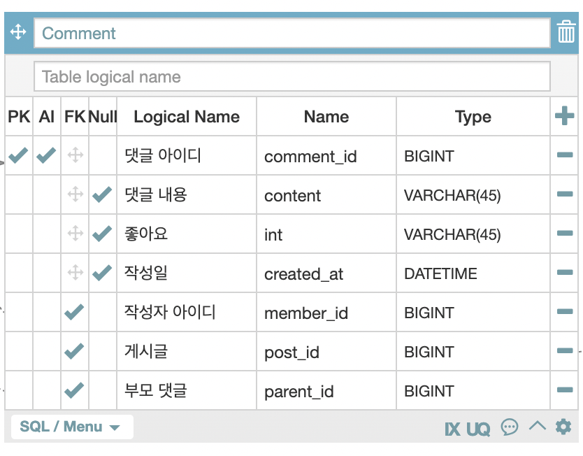 - Comment - 게시글이 있으면 댓글을 달아야 소통이 이루어지므로, 댓글에 관련된 데이터를 저장할 테이블입니다.