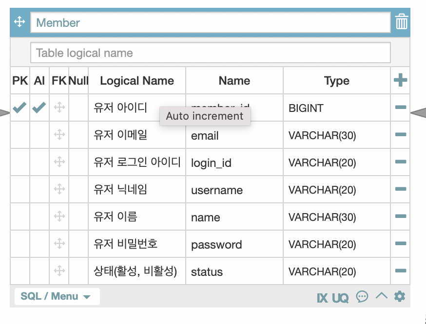 - Member - 게시판을 사용할 유저들의 정보를 저장할 테이블입니다.