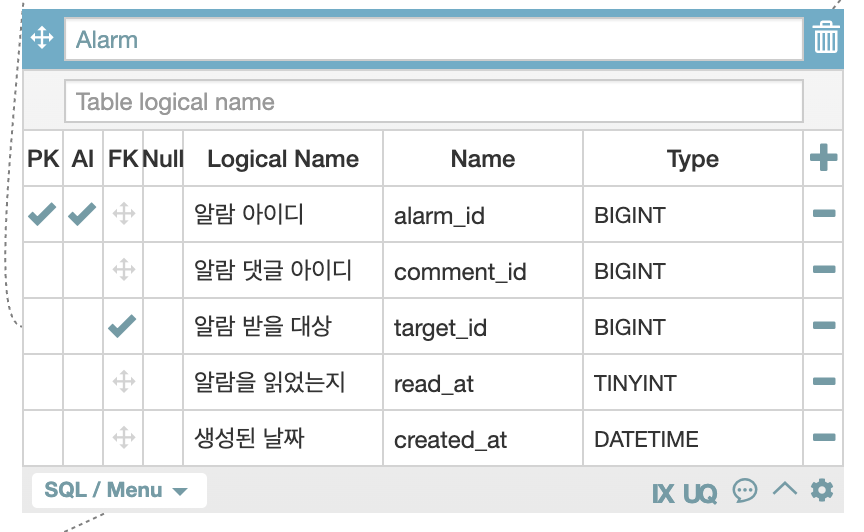 - Alarm - 개인적으로 고민을 정말 많이 한 테이블입니다. 결국 소통을 하기 위해서는 게시글에 댓글이 달리거나, 댓글에 대댓글이 달려야하는데 이를 알려주는 알람에 대한 정보를 저장하는 테이블입니다.