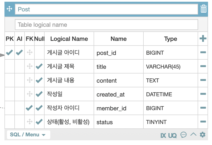 - Post - 게시판을 사용할 때 게시글을 작성하면 그에 대한 정보를 저장할 테이블입니다.