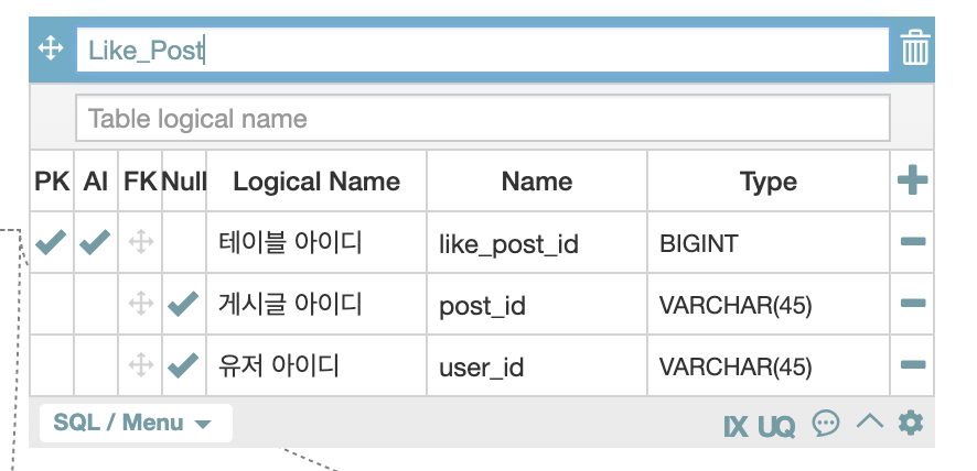 - 테이블의 기본키인 like_post_id가 존재하고, 좋아요를 누른 유저와, 좋아요를 받은 게시글의 아이디가 각각 존재합니다.
