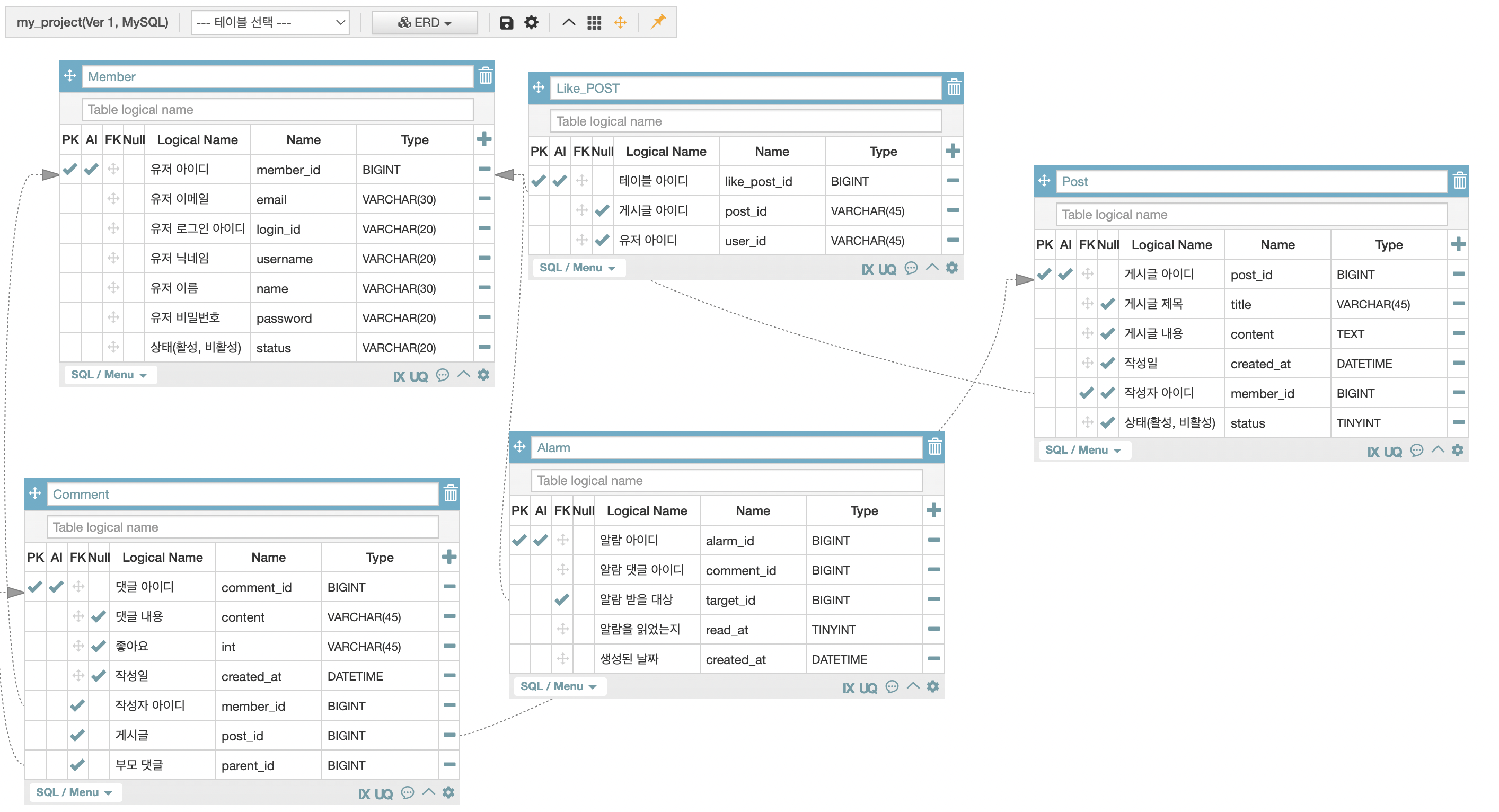 이렇게 뿌리가 될 게시판의 ERD 다이어그램 설계를 마쳤습니다. 간단한 5개의 테이블이지만 엄청나게 고민한 것 같습니다.
