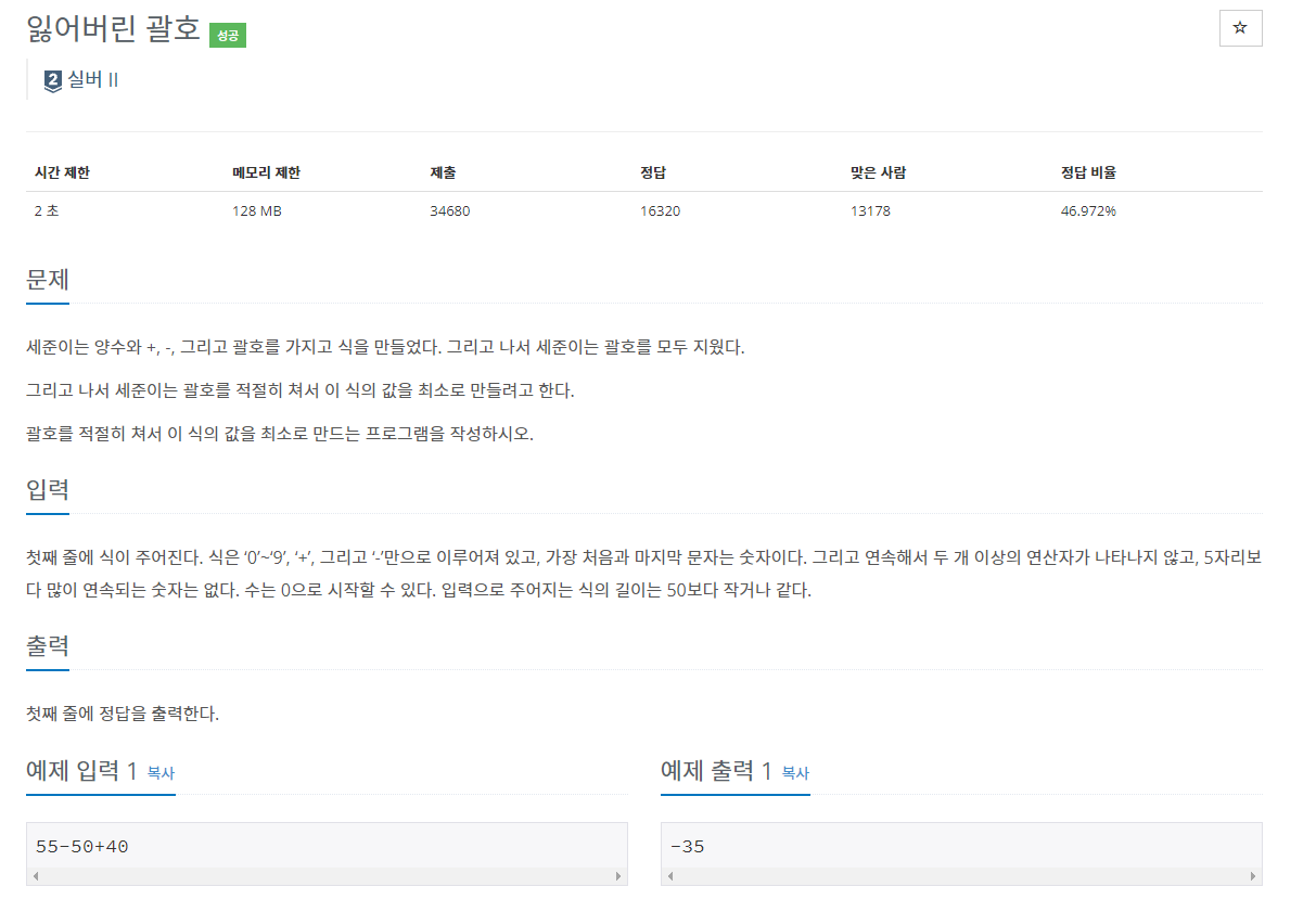 첫째 줄에 식이 주어진다. 식은 ‘0’~‘9’, ‘+’, 그리고 ‘-’만으로 이루어져 있고, 가장 처음과 마지막 문자는 숫자이다. 그리고 연속해서 두 개 이상의 연산자가 나타나지 않고, 5자리보다