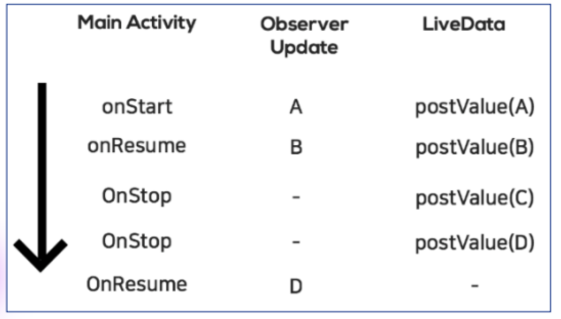 - LiveData는 컴포넌트의 생명주기를 알고 있기 때문에 액티비티가 onStart(), onResume() 상태일 때는 콜백을 실행하고, 다른 액티비티로 넘어가는 onStop()일 때는 실행하지 않는다.