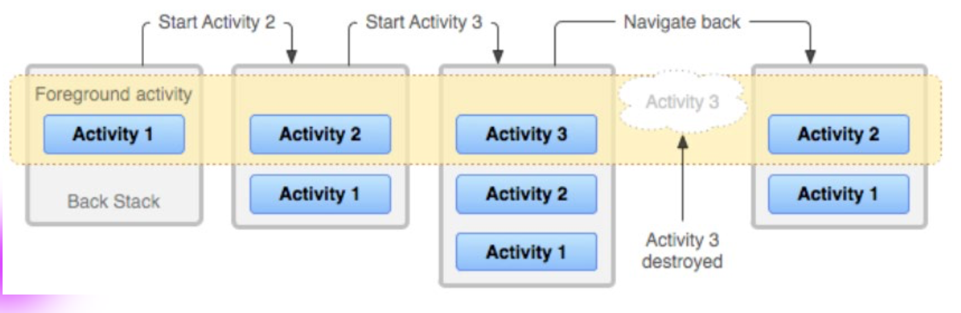 - 새로 액티비티가 생성이 되면 백 스택에 Push가 되면서 기존에 있던 액티비티는 아래로 감춰지게 되고, 뒤로가기를 눌러서 현재 액티비티를 종료시키면, 종료된 액티비티가 pop되면서 그 아래에 있던 액티비티가 push되어 포그라운드되는 구조다.