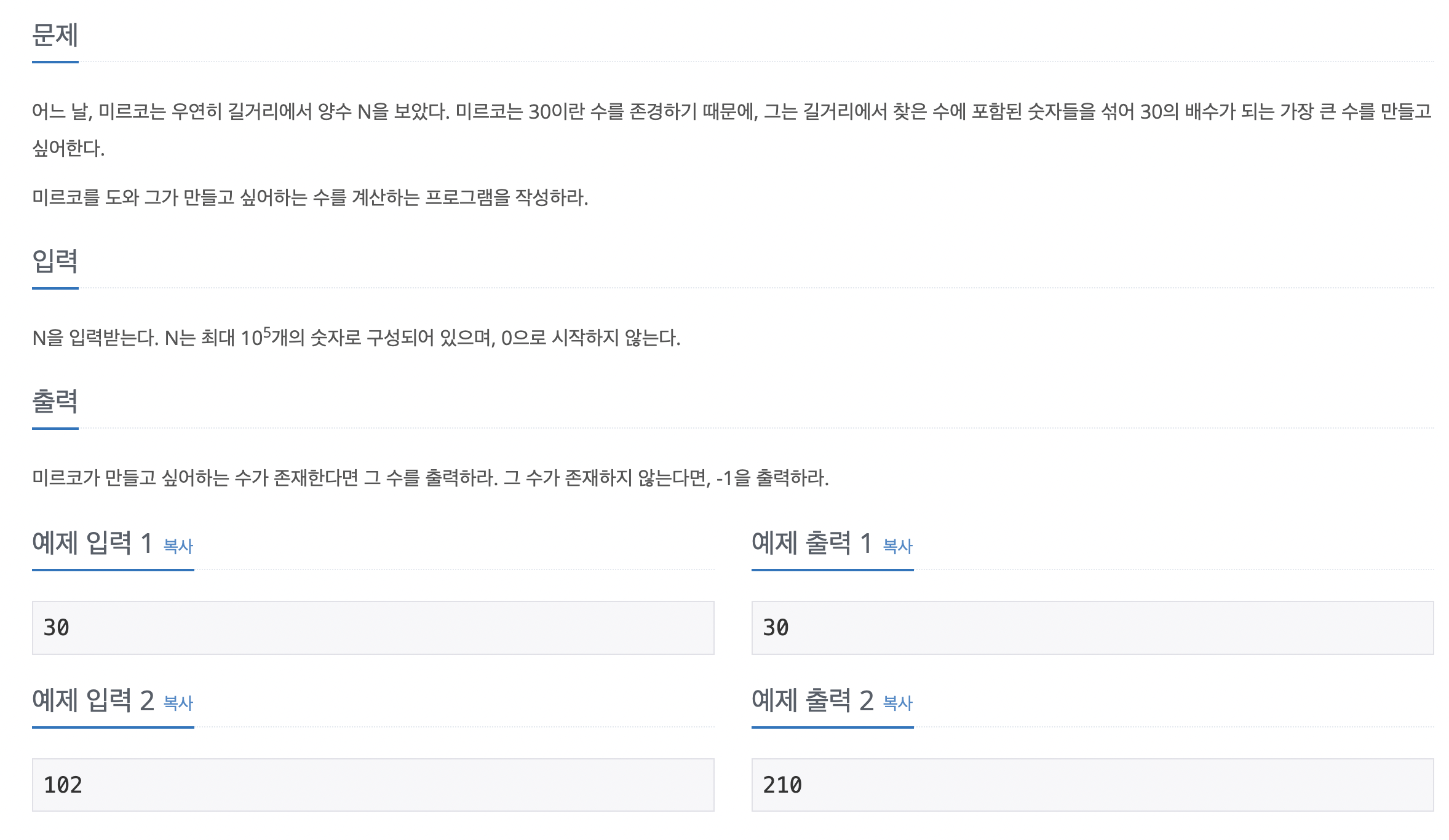 그러고 생각을 해보니 엄청 긴 문자열을 사용해 30인 배수인 수를 조합하고 그것들의 최댓값을 찾으라?!