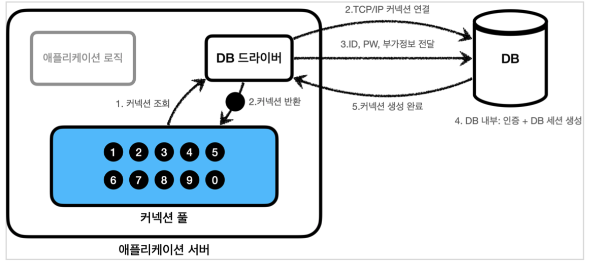- 커넥션 풀에 커넥션을 요청하면 커넥션 풀은 자신이 가지고 있는 커넥션 중에 하나를 반환하다.