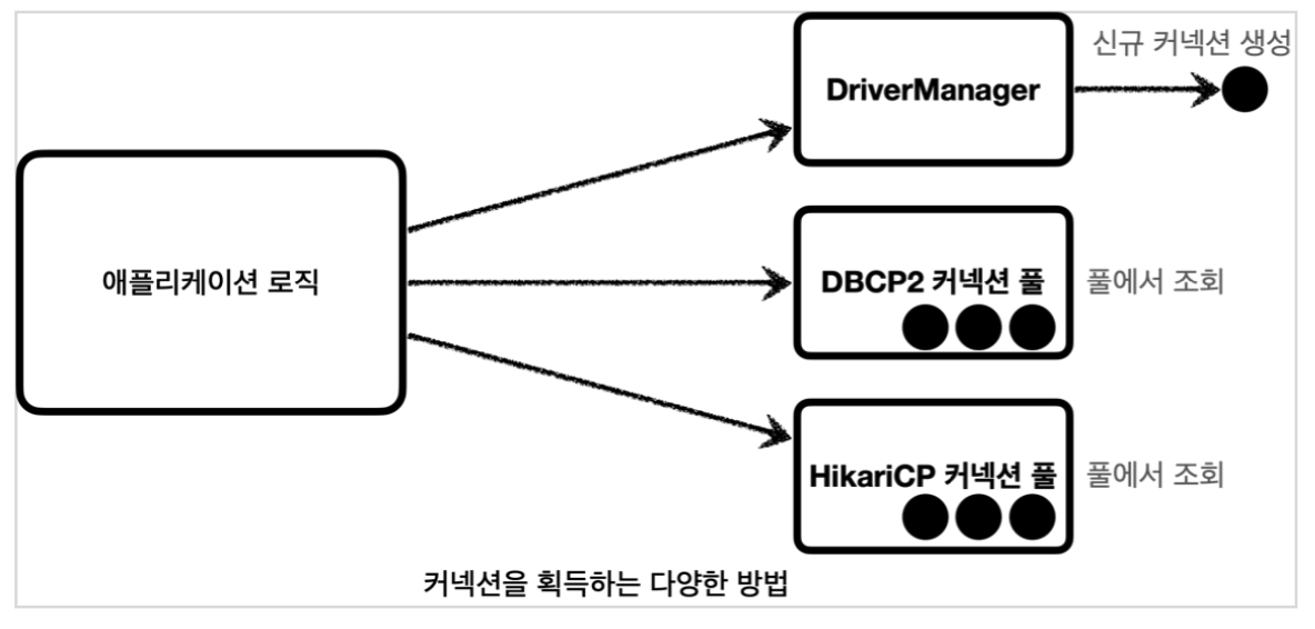 - 이제 애플리케이션 로직에서 DB 드라이버를 통해서 새로운 커넥션을 획득하는 것이 아니다.