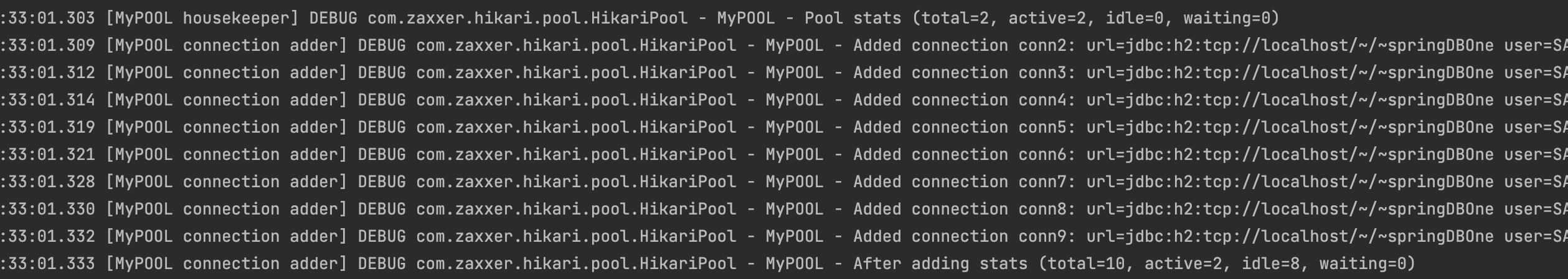 Thread.sleep를 통해 대기 시간을 주어야 쓰레드 풀에 커넥션이 생성되는 로그를 확인할 수 있다.