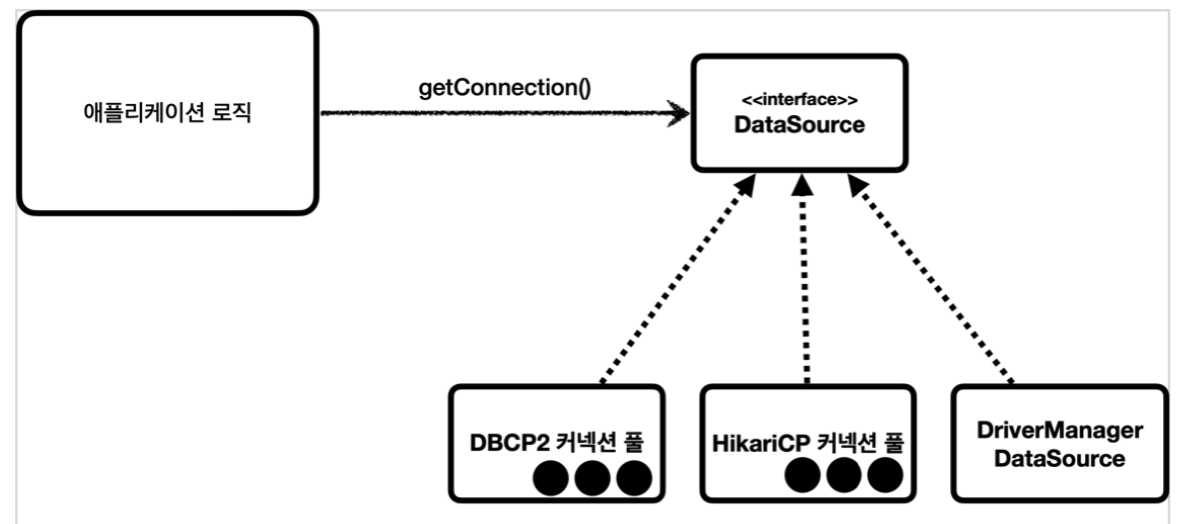 - 대부분의 커넥션 풀은 DataSource 인터페이스를 구현했다. 따라서 개발자는 특정 커넥션 풀의 코드에 의존하는 것이 아니라 DataSource 인터페이스에만 의존하도록 애플리케이션 로직을 작성하면 된다.