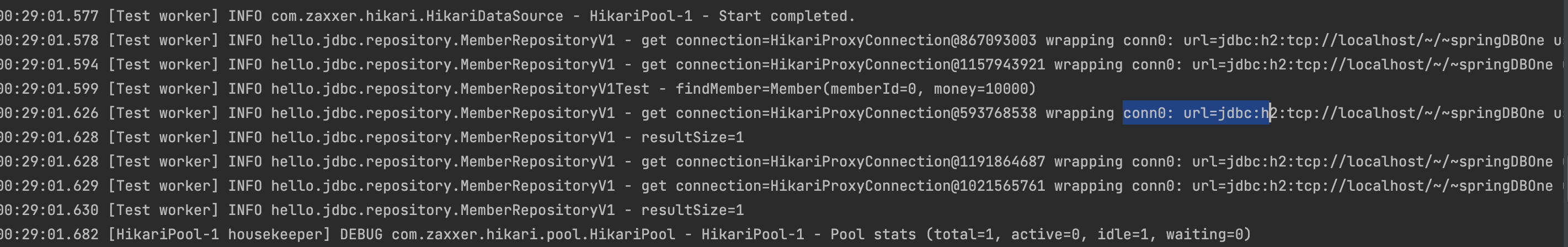 테스트는 순서대로 실행되기 때문에 커넥션을 사용하고 다시 돌려주는 것을 반복한다. 따라서 conn0만 사용된다.