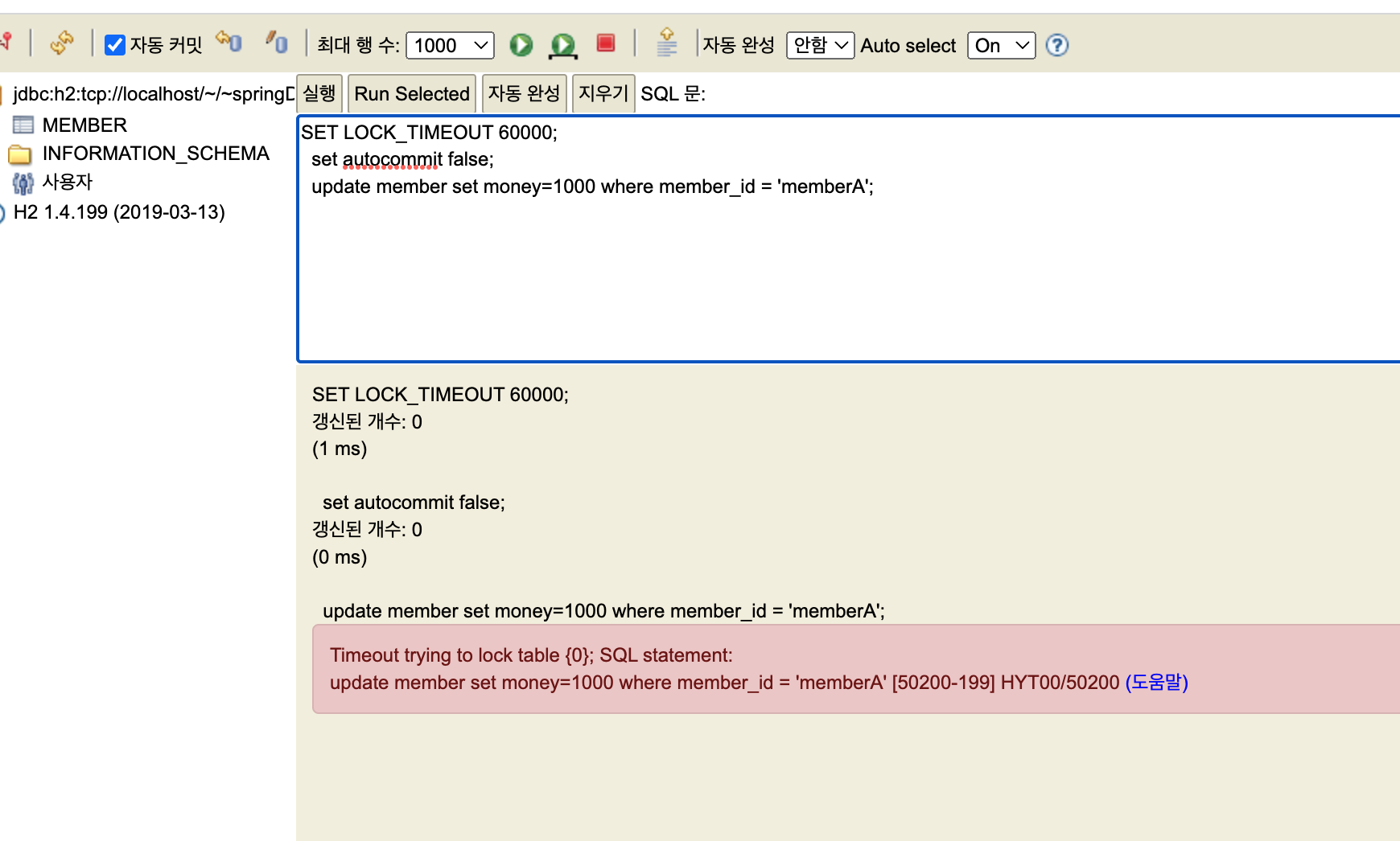 아래는 실습을 진행하다가 락 대기 시간을 넘어가면서 락 아웃 오류가 발생한 모습이다.