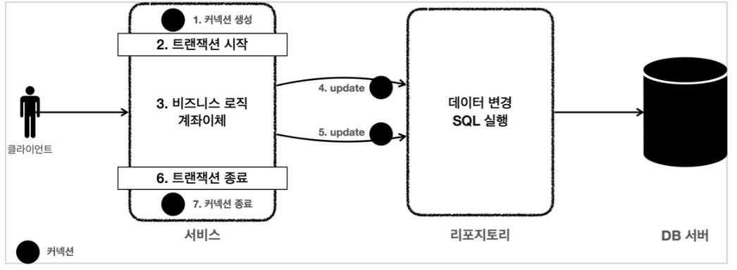 결국 서비스 계층에서 커넥션을 만들고, 트랜잭션 커밋 이후에 커넥션을 종료해야 한다. - 애플리케이션에서 DB 트랜잭션을 사용하려면 트랜잭션을 사용하는 동안 같은 커넥션을 유지해야 한다.