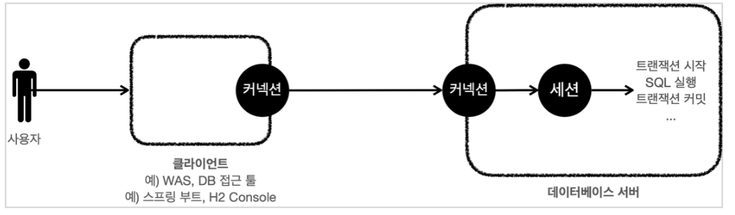 클라이언트는 데이터베이스 서버에 연결을 요청하고 커넥션을 맺게 된다. - 이때 데이터베이스 서버는 내부에 세션이라는 것을 만든다. 그리고 앞으로 커넥션을 통한 모든 요청은 이 세션을 통해서 실행한다.