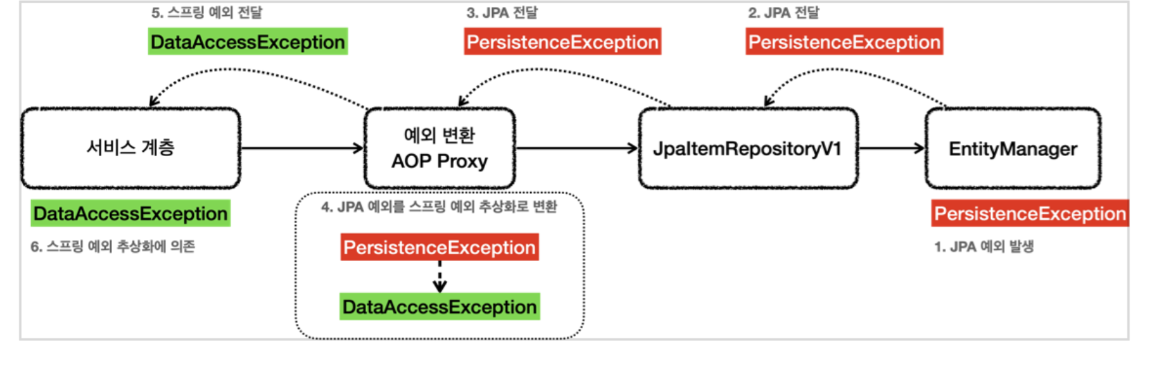 - 예외 변환 AOP 프록시는 JPA 관련 예외가 발생하면 JPA 예외 변환기를 통해 발생한 예외를 스프링 데이터 접근 예외로 변환한다.