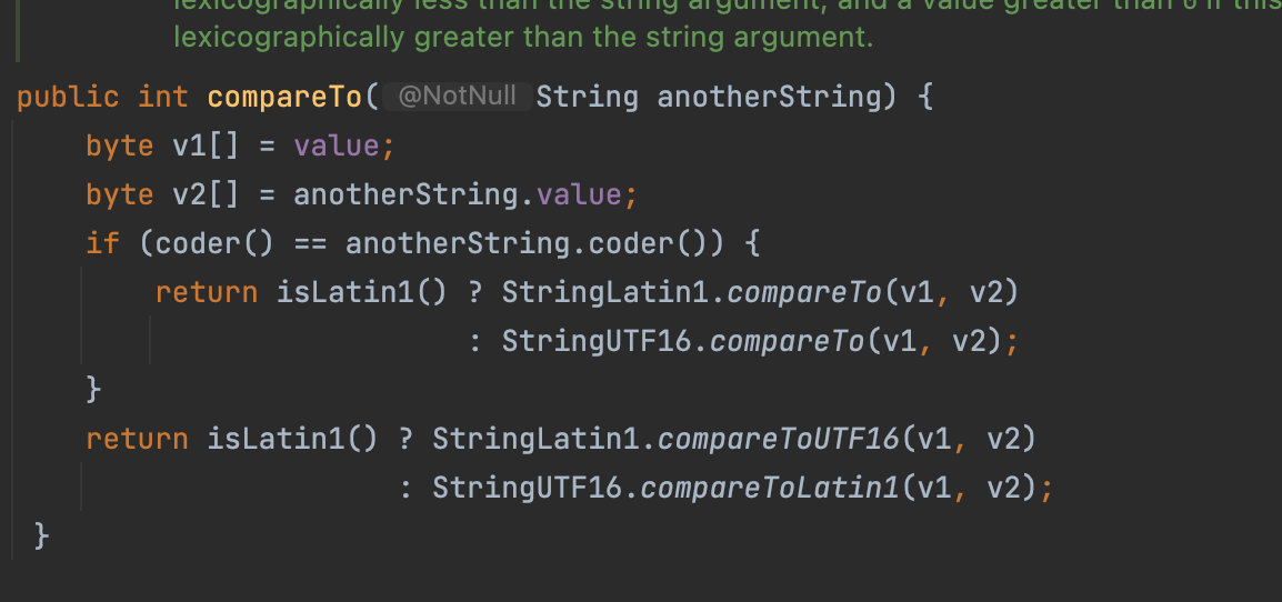 그리고 반드시 이를 오버라이딩해야한다. 오버라이딩한 compare 메서드에서 String 클래스의 compareTo 메서드를 사용했다.