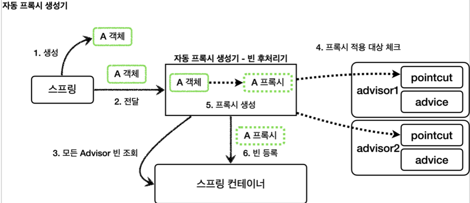- 이 빈 후처리기는 스프링 빈으로 등록된 Advisor 들을 자동으로 찾아서 프록시가 필요한 곳에 자동으로 프록시를 적용해준다.