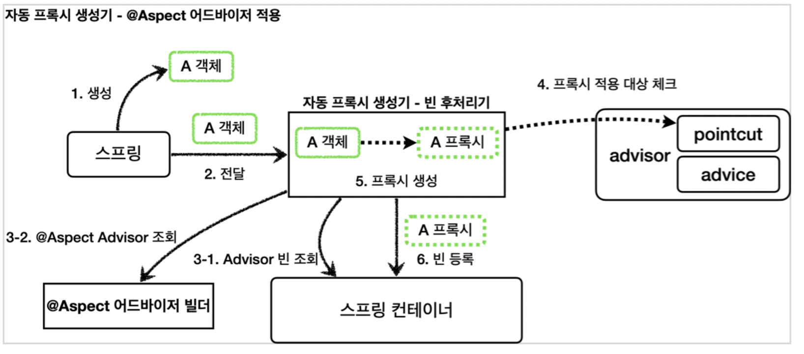 - 모든 @Aspect 빈 조회: 자동 프록시 생성기는 스프링 컨테이너에서 @Aspect 애노테이션이 붙은 스프링 빈을 모두 조회한다.