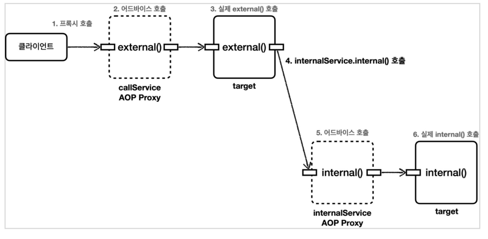 여기서 this는 target 즉 대상 객체다. 프록시 객체의 internal()이 아니라 타겟 대상의 internal()이므로 AOP가 적용되지 않는 것이다.