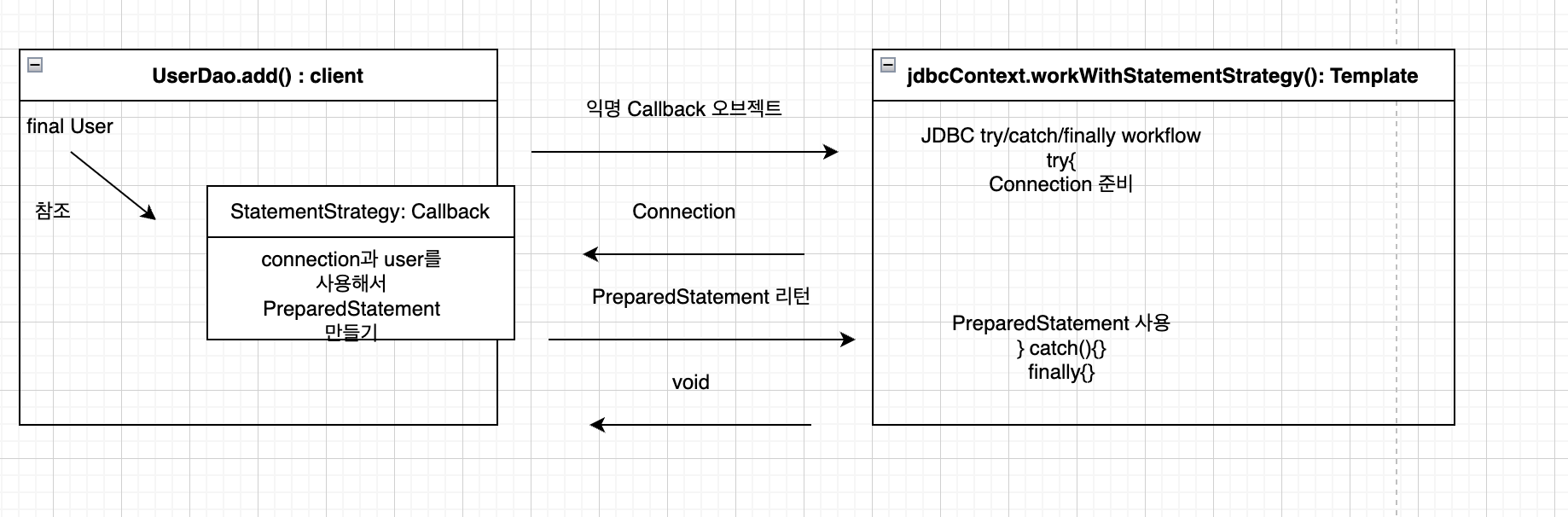 - DAO 메서드에서 StatementStrategy에 전달할 User와 같은 부가적인 정보가 있는 경우,