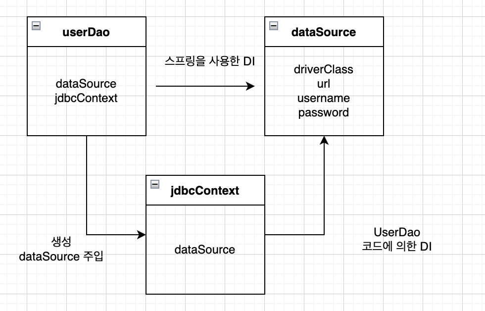 DataSource는 스프링 빈인데 JdbcContext가 스프링 빈이 아니므로 의존관계를 직접 주입해주어야 한다. - 사실 이 문제를 해결할 수 있다. JdbcContext의 제어권을 가지는 UserDao가 스프링 빈이므로 여기서 DataSource를 주입 받고, 동시에 JdbcContext에도 DataSource를 주입하는 것이다. 그러면 빈의 의존 관계는 아래와 같다.
