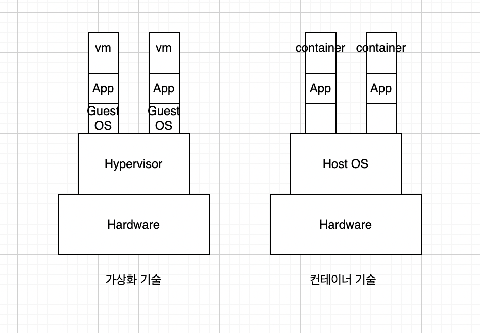 컨테이너는 가상화 기술과 달리 운영체제를 설치하지 않아도 된다. 더 가볍다는 뜻이다.