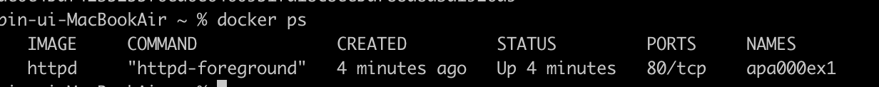 docker image pull, docker container create, docker container start라는 세 명령어를 합친 것과 같다. - --name apa000ex1: 해당 이름으로 컨테이너를 생성한다.