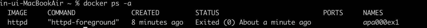 STATUS 항목에 Exited라고 나오면서 컨테이너가 종료된 상태라는 것을 알려준다.